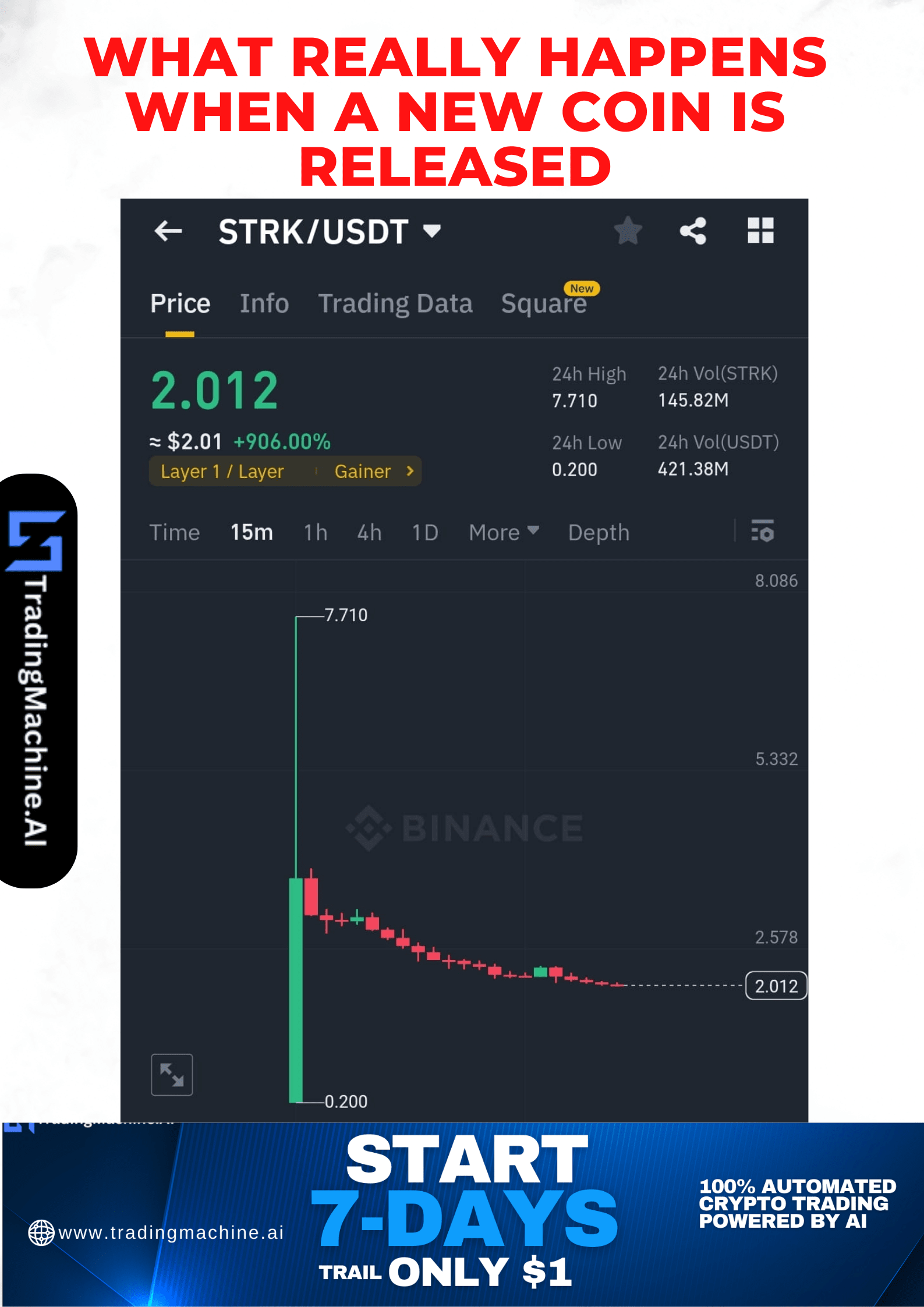 Prendi $STRK, ad esempio. Il suo minimo è di 0,2 dollari, il massimo di 7,7 dollari e il prezzo di apertura di circa 3 dollari.