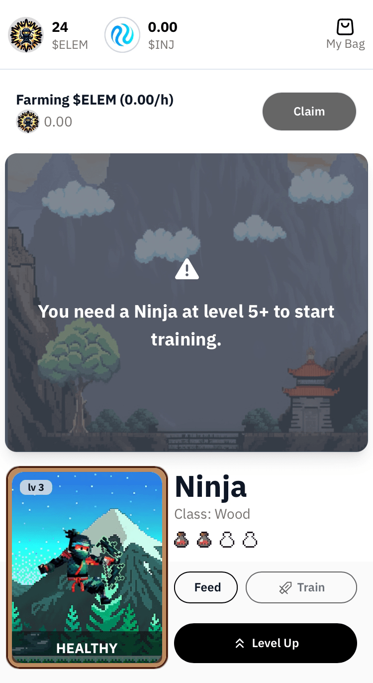 Puoi utilizzare i gettoni $ELEM per far salire di livello i tuoi Ninja. Ricorda che hai bisogno di un Ninja di livello 5+ per iniziare ad allenarti e guadagnare $ELEM aggiuntivi