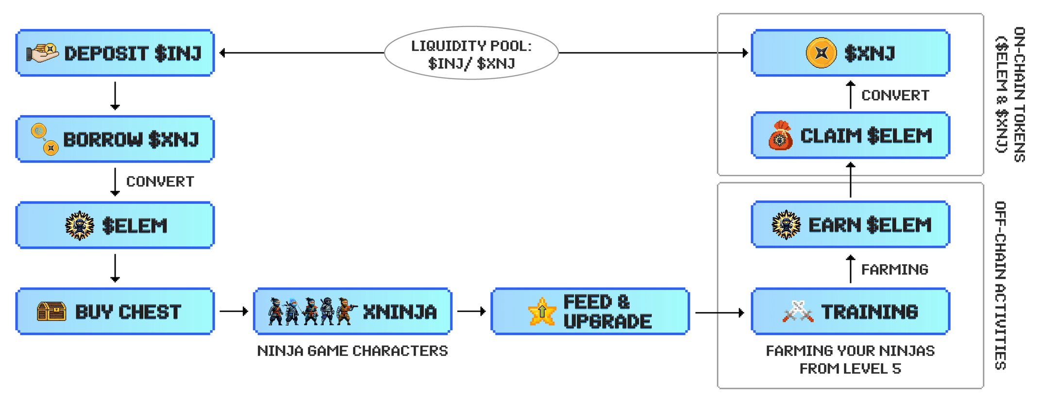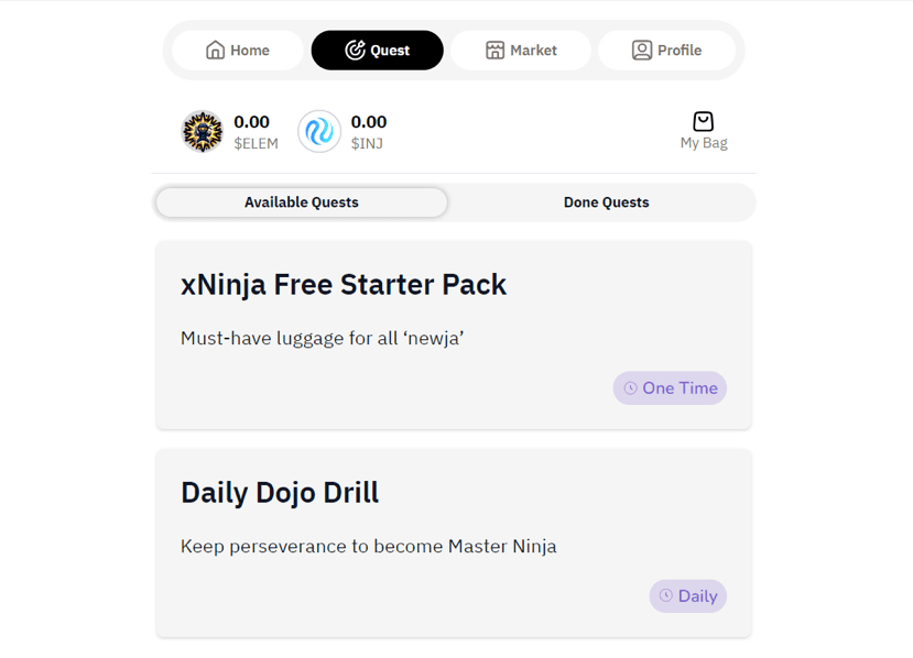 Successivamente potrai convertire i tuoi $XNJ in $ELEM, che potranno essere utilizzati per far salire di livello i tuoi ninja e acquistare prodotti alimentari dal mercato!