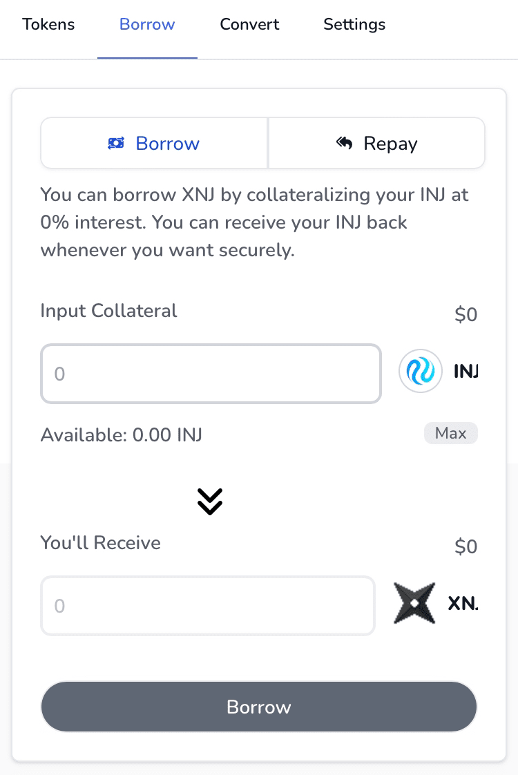 Una volta depositati i tuoi $INJ, puoi utilizzarli come garanzia per prendere in prestito $XNJ