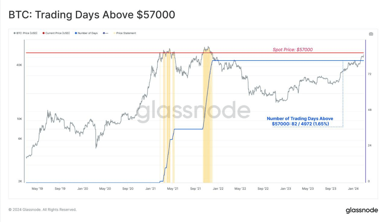 Poiché il prezzo spot di#Bitcoinha raggiunto i 57.000 $, notiamo che solo 82/4972 (1,65%) giorni di negoziazione hanno registrato un prezzo di chiusura giornaliero più alto.