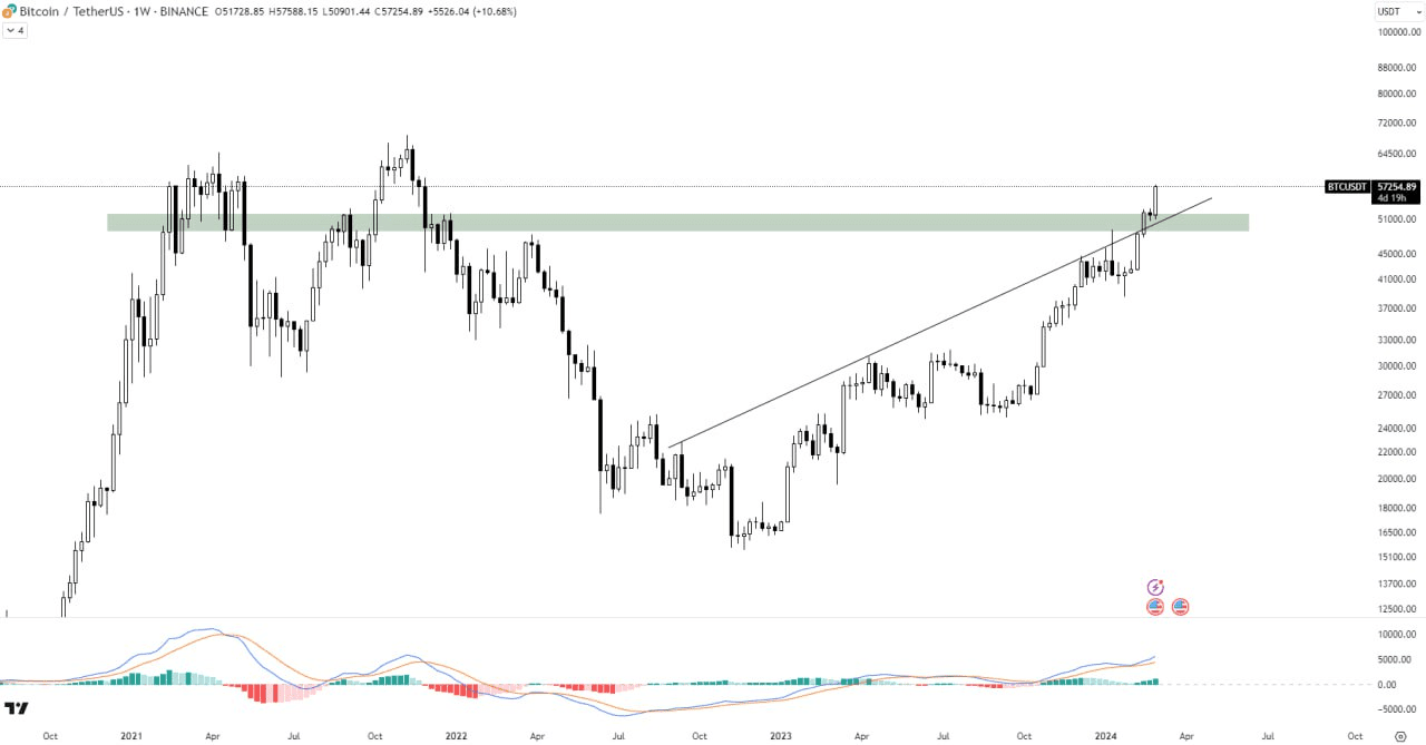 Prima di credere a qualsiasi affermazione, è meglio ricontrollare le affermazioni e i fatti. Bitcoin ha chiaramente superato l'area dei 54.000 e ora si trova a 64.000. Il prossimo massimo storico è a solo il 13% di distanza. E il prossimo grande supporto è a un altro 15%.