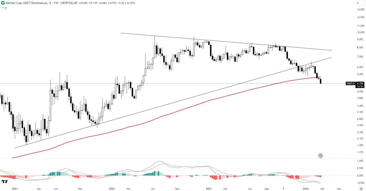 USDT.D continua il suo movimento ribassista dopo aver rotto il triangolo simmetrico. Ha ora superato con successo la media mobile a 200. Il crossover del MACD indica un momentum ribassista.