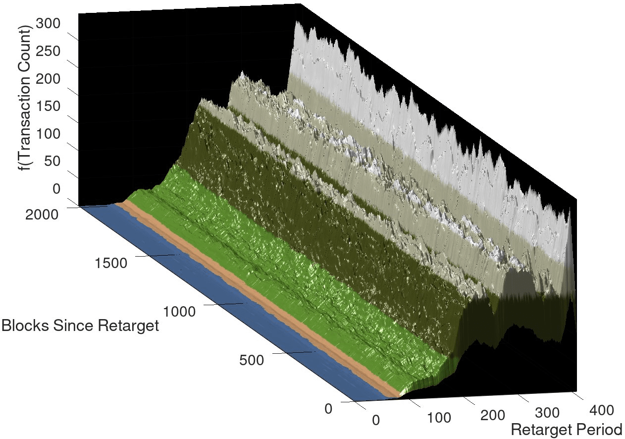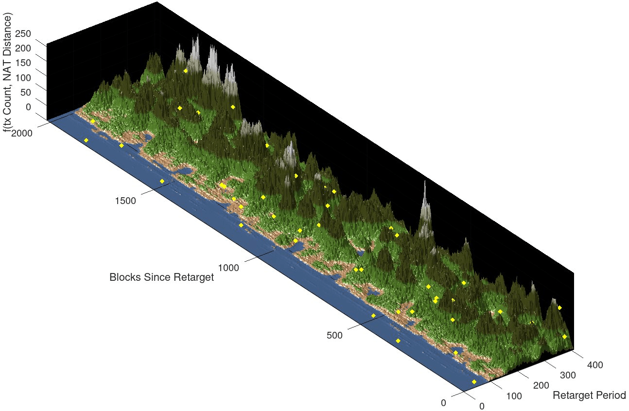 Il documento fornisce l'esempio NAS più semplice, utilizzando il periodo di aggiustamento della difficoltà di Bitcoin (periodo di retarget) come asse x dello spazio, il numero di blocchi dopo l'aggiustamento della difficoltà (blocchi dal retarget) come asse y e il numero di transazioni in ciascun blocco (conteggio delle transazioni) come asse z