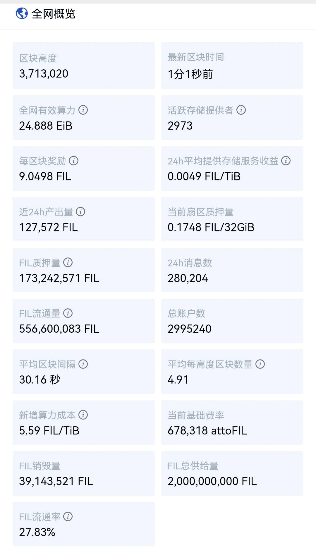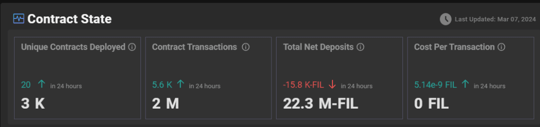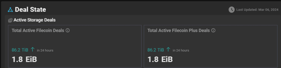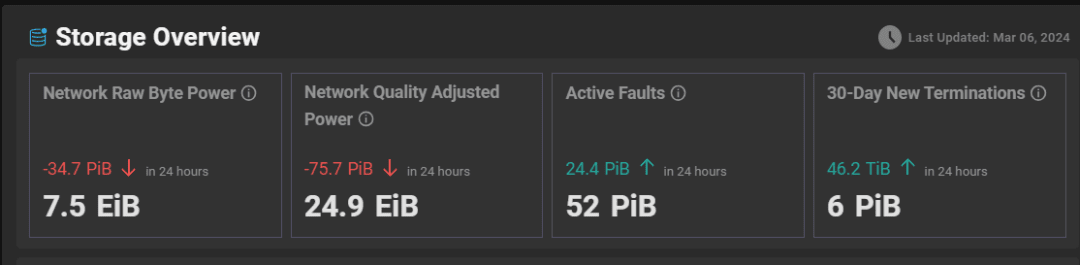 Le statistiche di Filecoin riportano che la potenza di calcolo effettiva dell'intera rete è di 24.888EiB (l'attuale più alta è 25.112EiB, che è diminuita di 0,06EIB (61,44PiB) nelle ultime 24 ore dalle 11:30 del 5 marzo alle 11:30 del 5 marzo. 6 marzo. );