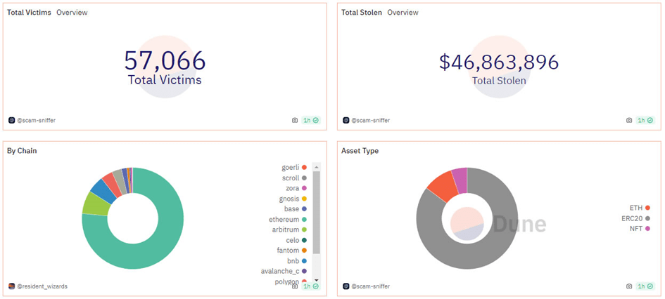 Il rapporto ha inoltre affermato che la mainnet di Ethereum era il bersaglio principale degli attacchi, con il 78% dei fondi rubati costituiti da token ERC-20, che rappresentano l'86% del valore totale degli asset rubati. Gli attacchi spesso si basavano su truffe in cui gli utenti venivano convinti a firmare transazioni pericolose come Permit, IncreaseAllowance e Uniswap Permit2.