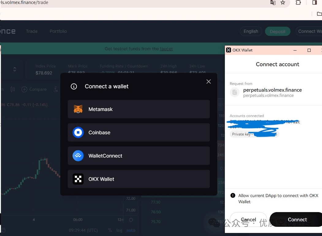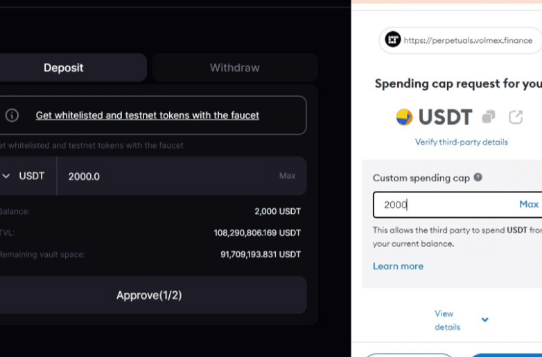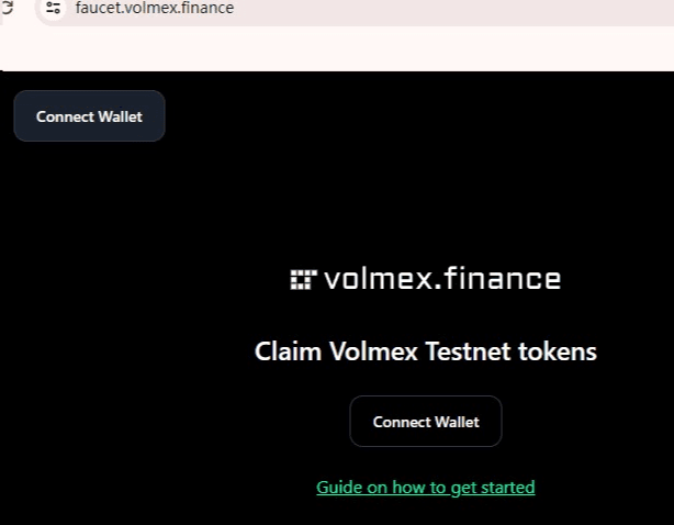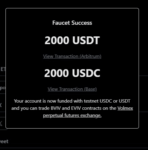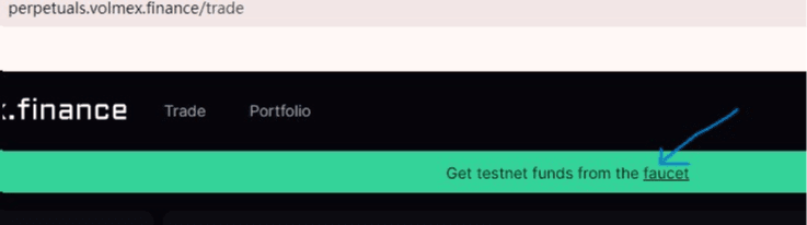 Facendo clic sul collegamento ipertestuale Volmex Perpetuals Testnet si accederà alla pagina di test della transazione. In questa pagina, vai prima all'acqua (token di prova) e fai clic sul collegamento ipertestuale del rubinetto Ottieni fondi testnet dal rubinetto.