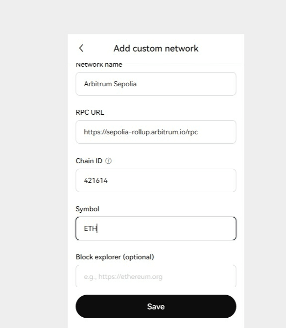 Innanzitutto, devi aggiungere la rete di test Sepolia arbitraria al tuo portafoglio Trova e aggiungi una rete personalizzata nel tuo portafoglio e inserisci quanto segue.