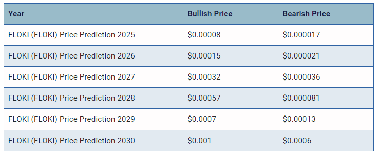 Previsione del prezzo di FLOKI (FLOKI) 2025, 2026 – 2030/h2Con l'aiuto degli indicatori di analisi tecnica e dei modelli di tendenza sopra menzionati, prevediamo il prezzo di FLOKI (FLOKI) tra il 2025, 2026, 2027, 2028, 2029 e 2030.