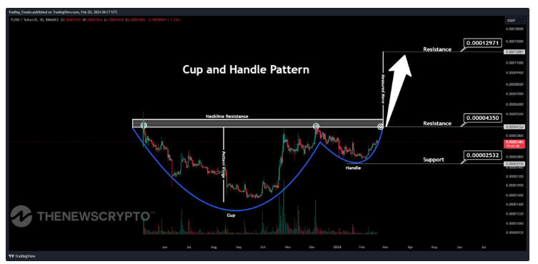 Nel grafico sopra, FLOKI (FLOKI) ha esposto il pattern Cup and Handle che emerge quando il movimento del prezzo di un titolo assume la forma di una "tazza", seguita da un pattern di tendenza al ribasso che forma il "manico". Questo calo, o "manico", è considerato un segnale per un'opportunità di acquisto per adottare una posizione lunga.