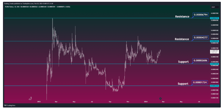Livelli di resistenza e supporto FLOKI/USDT (Fonte: TradingView)Dal grafico soprastante, possiamo analizzare e identificare i seguenti livelli di resistenza e supporto di FLOKI (FLOKI) per il 2024.