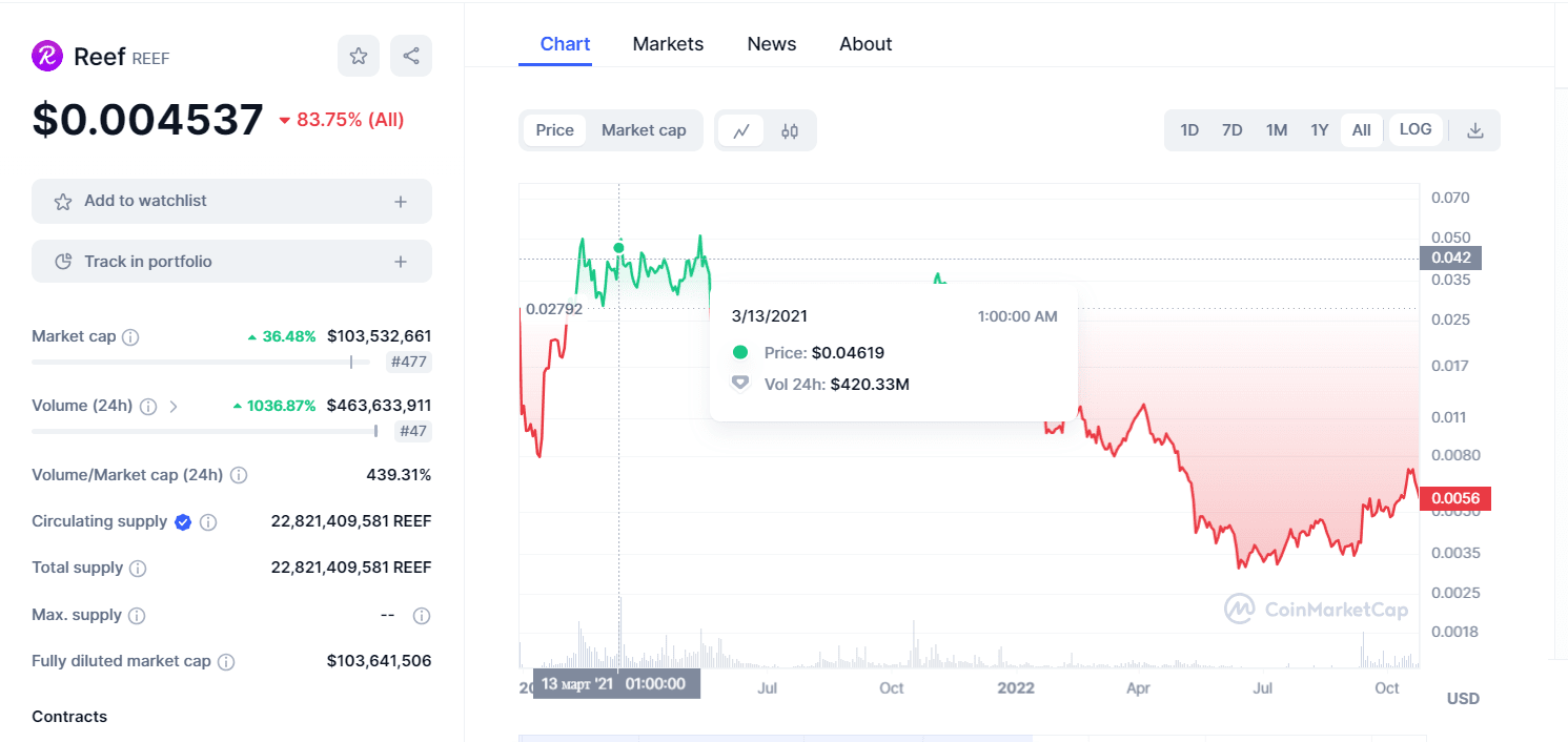 Ma oggi, esattamente due anni dopo, costa solo $ 0,004553! Riuscite ad immaginare questo crollo dei prezzi? Con i miei $100 sono riuscito ad accaparrarmi 21.963 di questi token. E sono fiducioso che andando avanti, REEF, come molte altre monete, continuerà la sua marcia vittoriosa.