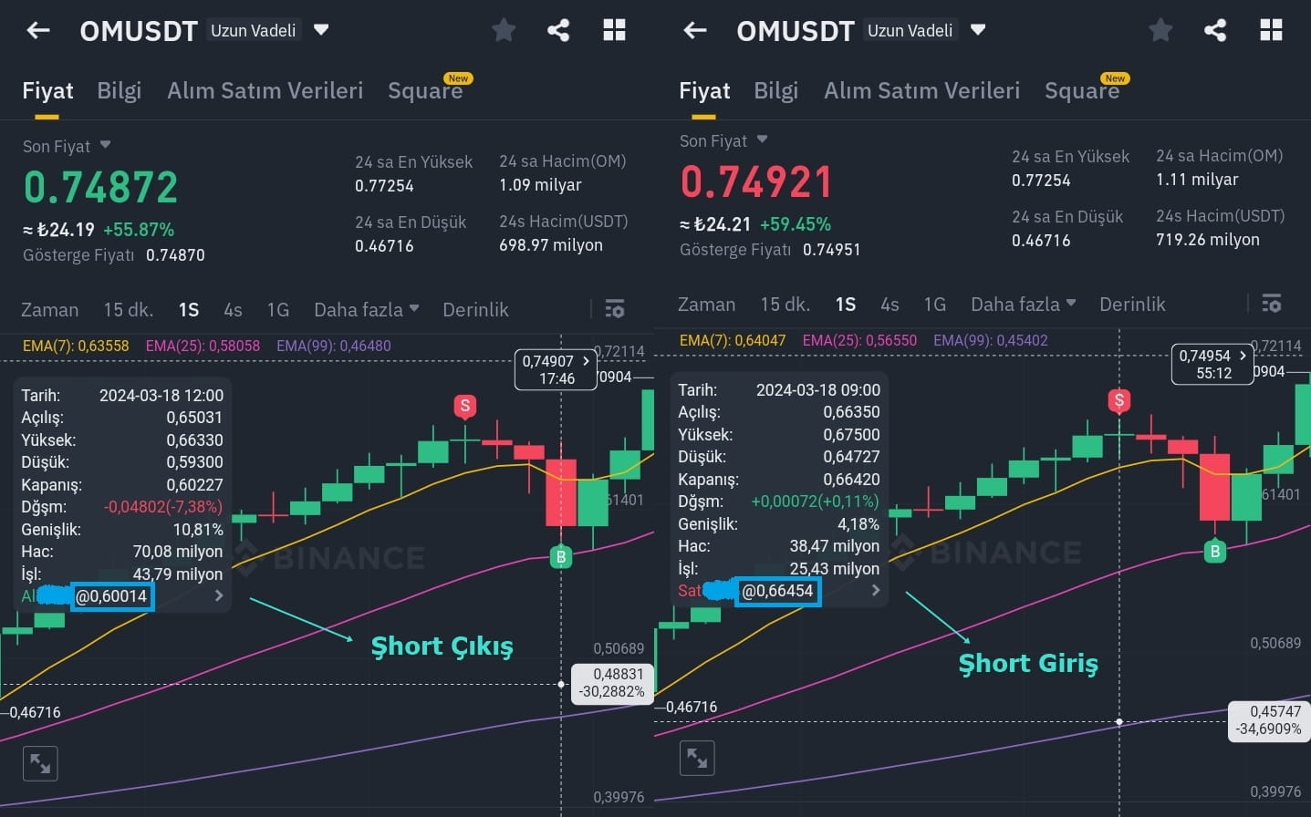 Come puoi vedere nell'immagine, ho aperto una posizione short sulla parità OMUSDT al prezzo di 0,66454 con leva 10x e ho fissato il mio obiettivo di profitto al 10% secondo la mia attuale analisi. Quando il risultato ha raggiunto il mio obiettivo di prezzo, ho chiuso la mia posizione e poiché il guadagno era superiore al 100%, ho raddoppiato il denaro investito. Anche se in seguito il prezzo è leggermente sceso, in seguito è aumentato notevolmente. Attualmente OMUSDT è intorno a 0,82. Se non avessi realizzato un profitto, avrei triplicato i miei soldi, figuriamoci raddoppiati. Quindi non dimenticare di trarre profitto.