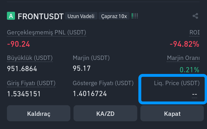 Il margine isolato può sembrare più sicuro a molte persone. In realtà la situazione non è così innocente. Posso spiegare questa situazione con un esempio. Ad esempio, hai aperto una posizione short con una leva 10x sul margine isolato. Il prezzo di liquidazione sarà superiore dell'8% al prezzo inserito. In altre parole, quando dici che una moneta scenderà a 0,50 $, il denaro depositato verrà liquidato quando raggiungerà 0,54 $. La maggior parte delle persone tenta di correggere la media quando il prezzo inizia a muoversi nella direzione opposta. Quindi aggiungi alla tua posizione. Supponiamo che tu effettui un'aggiunta uno a uno appena al di sotto del prezzo al quale verrai liquidato. Questa volta il costo di ingresso sarà al massimo di $ 0,52 e la liquidazione avverrà a $ 0,56. Quindi gradualmente la tua liquidazione si avvicinerà al prezzo attuale. Anche se aggiungi uno a uno. Alla fine la tua ultima posizione verrà liquidata.