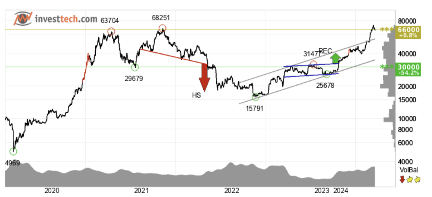 In un breve periodo, un grafico mensile mostra che ogni candela rappresenta un mese e mostra importanti zone di supporto e resistenza come le zone verdi a 41.000$ e 51.700$. E mostra che gli investitori hanno acquistato Bitcoin a un prezzo più alto nel tempo e indica un buon sviluppo per Bitcoin.