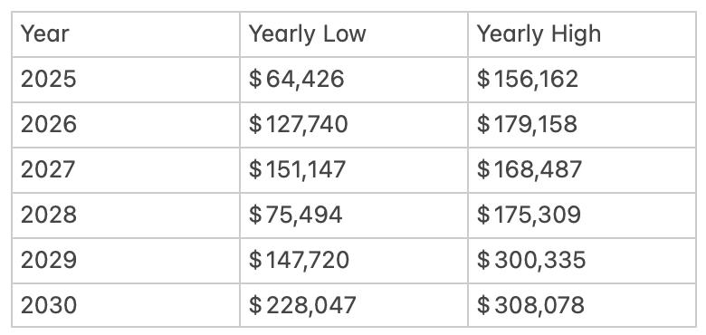 Nel frattempo qualche "visionario" ha previsto che il prezzo del Bitcoin raggiungerà i 150.000$ l'anno prossimo. E ho trovato alcune previsioni per ogni anno fino al 2030.
