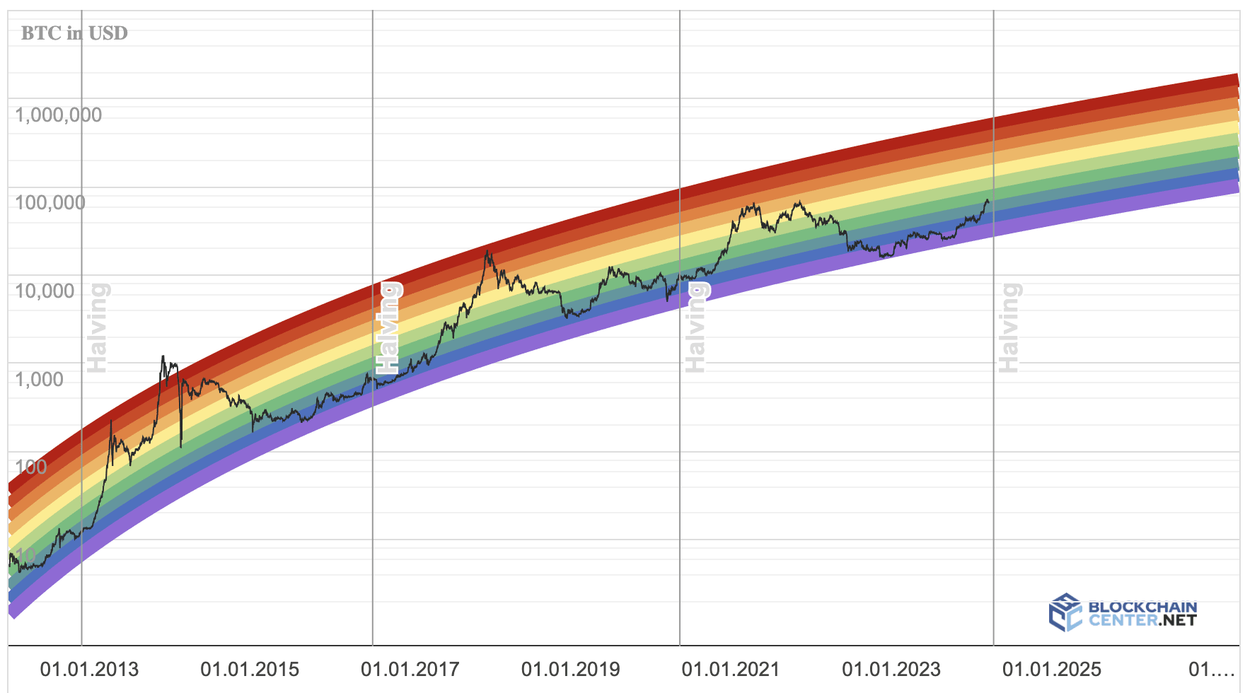 E penso che uno strumento più importante per l'analisi dei prezzi sia un grafico arcobaleno Bitcoin. Puoi trovarlo su blockchaincenter.net e questo grafico è uno strumento di valutazione a lungo termine per Bitcoin. Utilizza una curva di crescita logaritmica per prevedere la potenziale direzione futura del prezzo di Bitcoin.