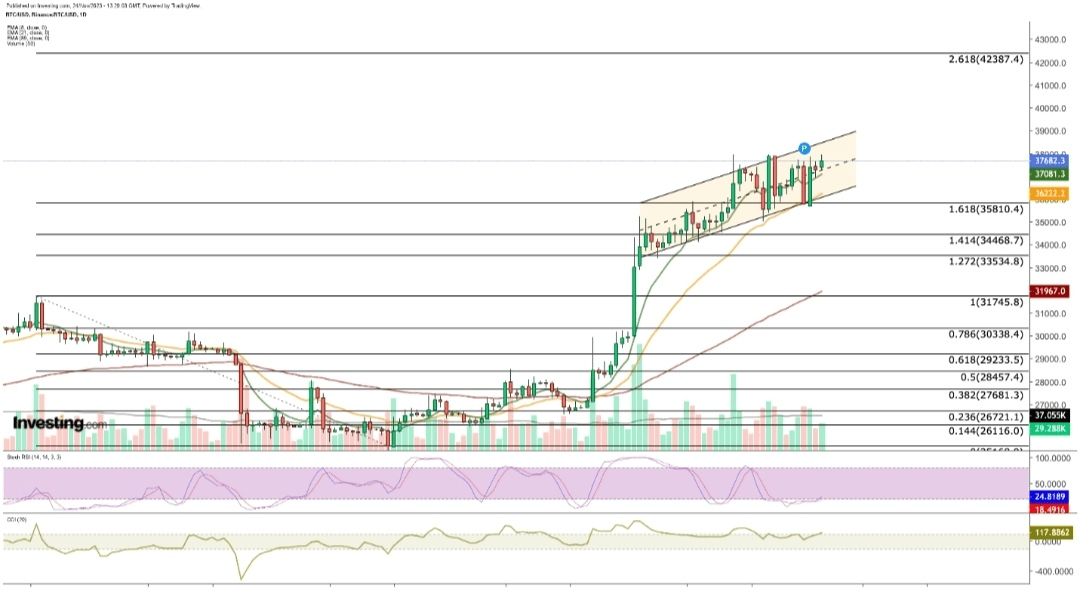 Il Bitcoin è rimasto in un modello laterale nella fascia di 35.500 - 37.500 dollari all'interno del canale ascendente di novembre. A questo punto, notiamo che la criptovaluta, che ha superato l'area di estensione di Fibonacci secondo l'ultimo slancio ribassista, ha convertito il valore di Fibonacci 1,618 in supporto. A novembre, una resistenza media si è formata nell'area ristretta che va da 37.500 a 38.000 dollari. Subito sopra questa resistenza, potrebbe formarsi una seconda linea di resistenza a 38.500 - 38.600 dollari nel breve termine.