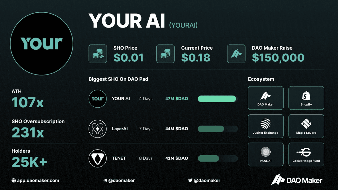 YOURAI (107x): il protocollo YOURAI è un livello di contenuti di e-commerce basato sull'intelligenza artificiale costruito su Bitcoin e Solana, con un ATH di 107x e oltre 25.000 titolari.