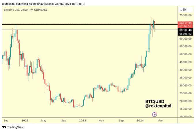 In base ai dati storici, sembra che stia per verificarsi un rally selvaggio nel prezzo di Bitcoin. Anche altri analisti del ciclo di mercato condividono opinioni simili a Boyapati. Ad esempio, l'analista di ricerca sulle criptovalute Rekt Capital ha osservato che una chiusura settimanale al di sopra del massimo del ciclo del 2021 di $ 69k è fondamentale per giustificare un ulteriore rialzo.