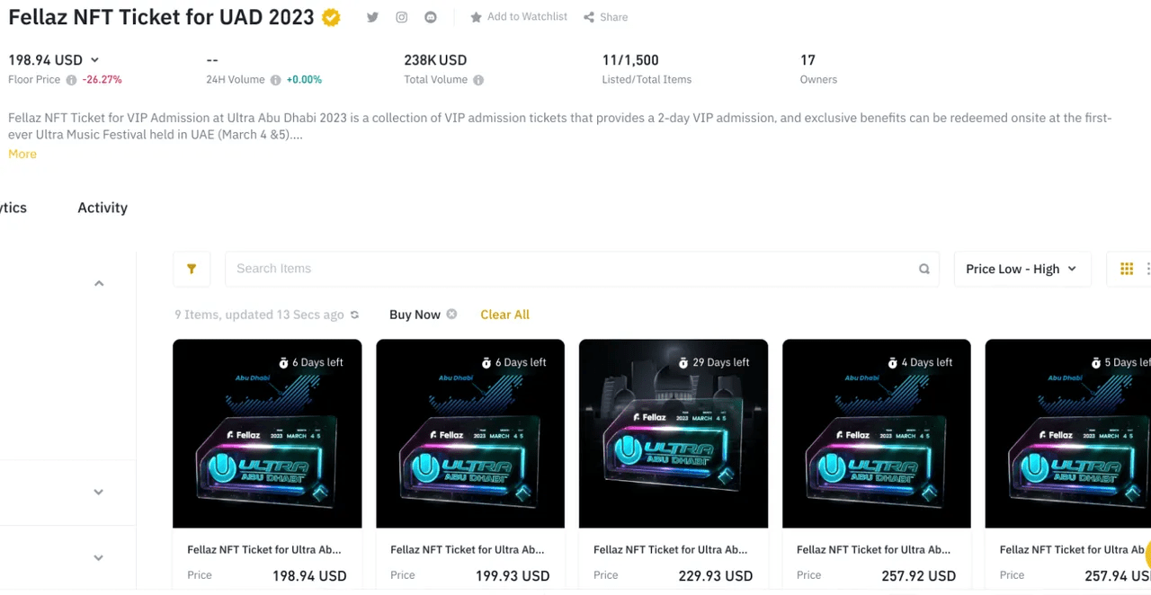 La vendita su Binance si è conclusa il 3 marzo, ma il conio su Xclusive è continuato per altre 24 ore. Su Binance, a volte il prezzo minimo scende al di sotto del prezzo ufficiale di 260$. Immagino che alcune persone abbiano acquistato questi biglietti senza rendersi conto che non si tratta di una raccolta ma di un token di utilità. Alcuni forse non hanno potuto partecipare. Dopo un po' di attesa e ricerca, sono riuscito a procurarmi un biglietto per $ 188! Sicuramente soddisfatto di ciò.