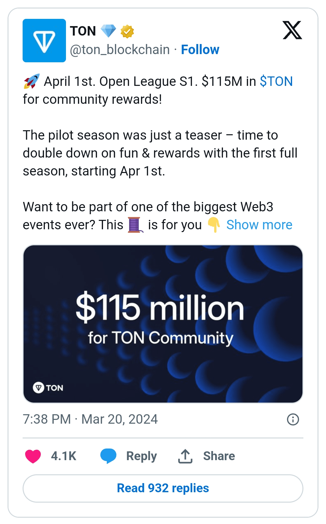 La Fondazione TON ha annunciato che la prima stagione dell'iniziativa Open League verrà lanciata il 1 aprile. L'iniziativa, che sarà condotta attraverso stagioni mensili, distribuirà 30 milioni di TON (circa 160 milioni di dollari ai prezzi attuali) in premi totali ad entrambi team di sviluppo che si basano sulla blockchain TON e sugli utenti della piattaforma.