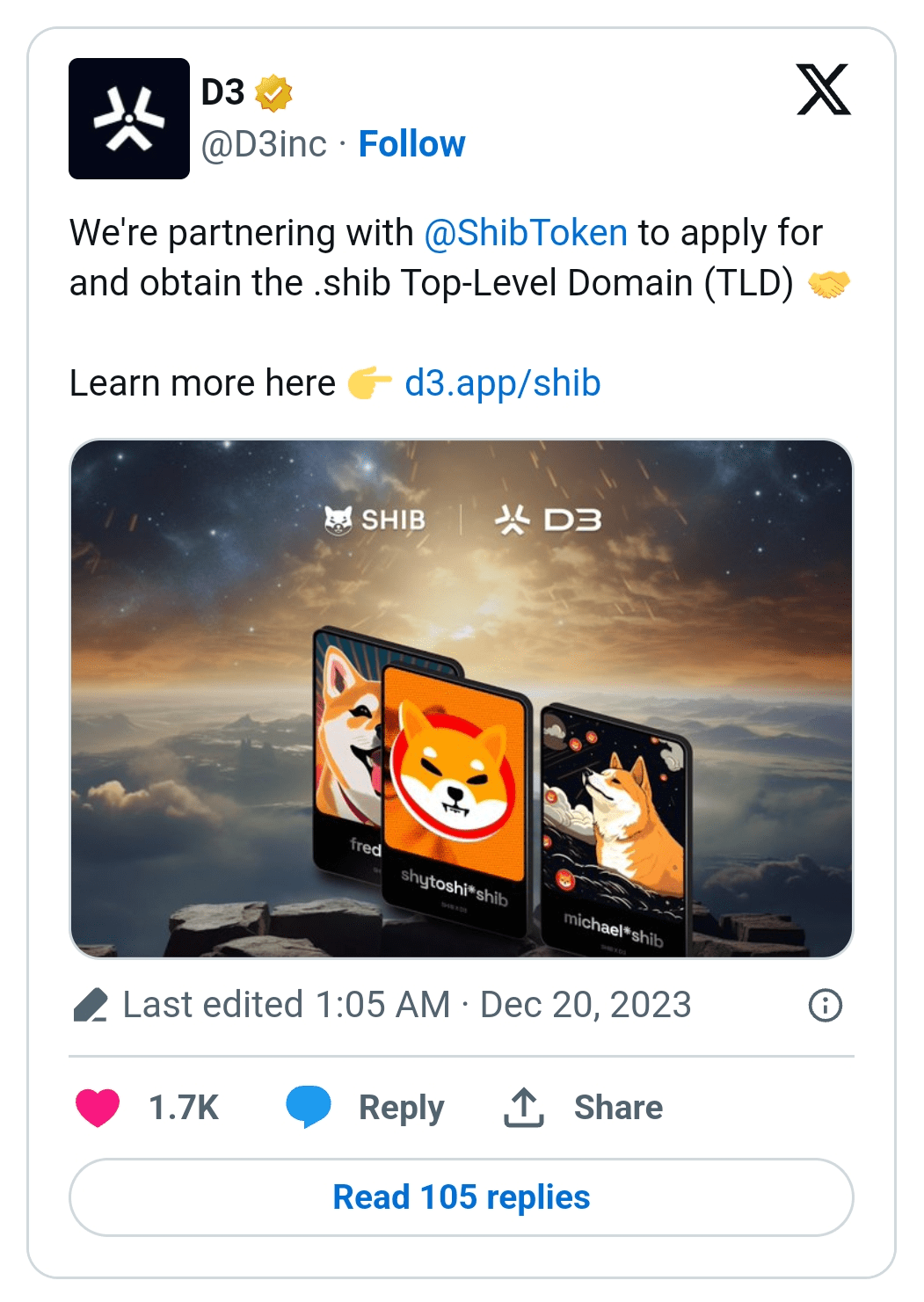 Il team Shiba Inu ha collaborato con il progetto del dominio web3 D3 nel tentativo di ottenere il TLD .shib. Le implicazioni dell'aggiunta di .shib al Domain Name System globale vanno oltre i semplici siti Web di vanità. D3 spiega che gli attuali nomi di dominio crittografici come .crypto non funzionano in modo nativo su tutte le piattaforme, mentre Shib mira a una vera compatibilità incrociata con i servizi che le persone utilizzano quotidianamente.