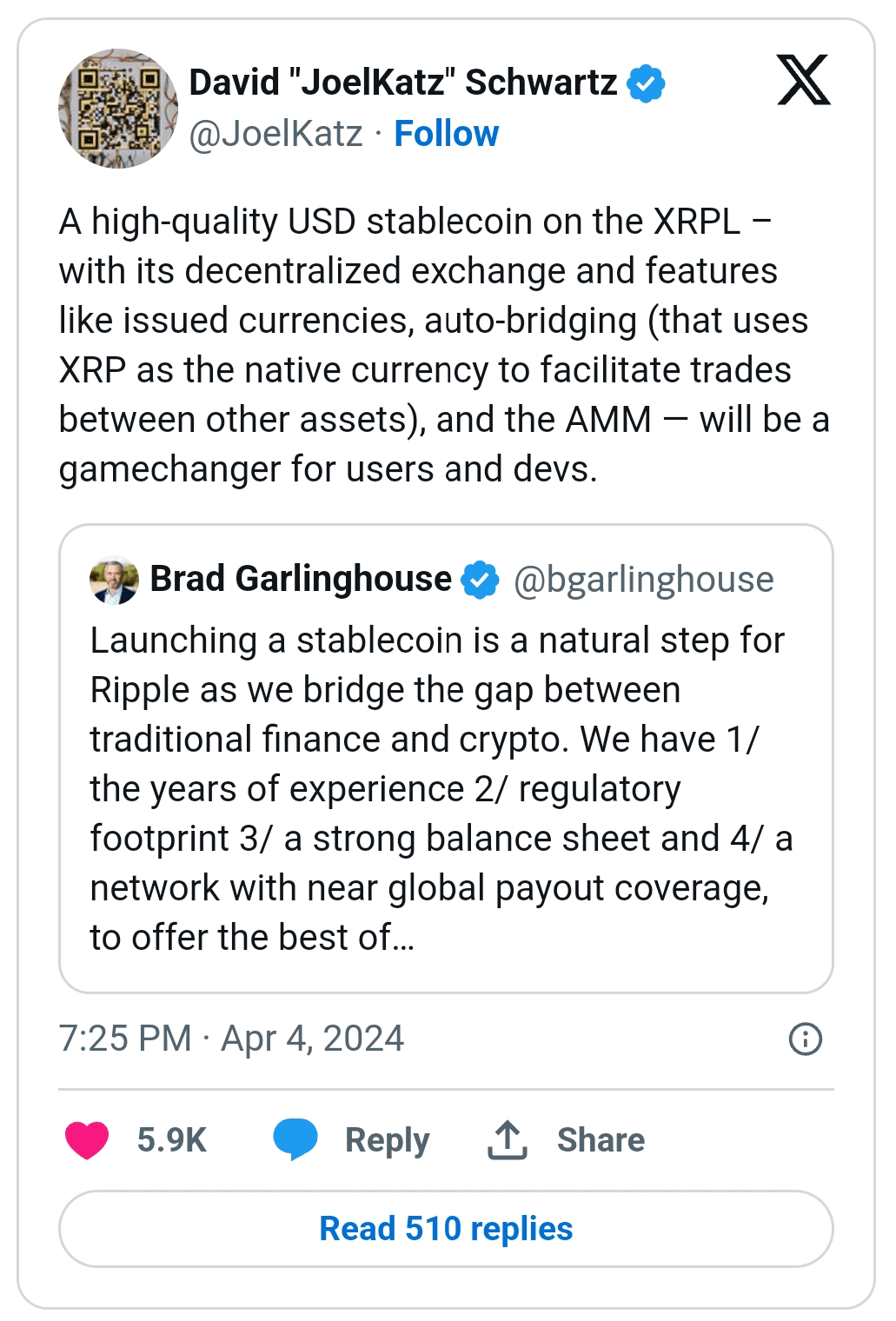 David Schwartz, CTO di Ripple e uno degli architetti originali di XRP Ledger, ha affermato che una stablecoin sostenuta da USD sulla piattaforma XRP Ledger sarà un "punto di svolta" sia per gli utenti che per gli sviluppatori.