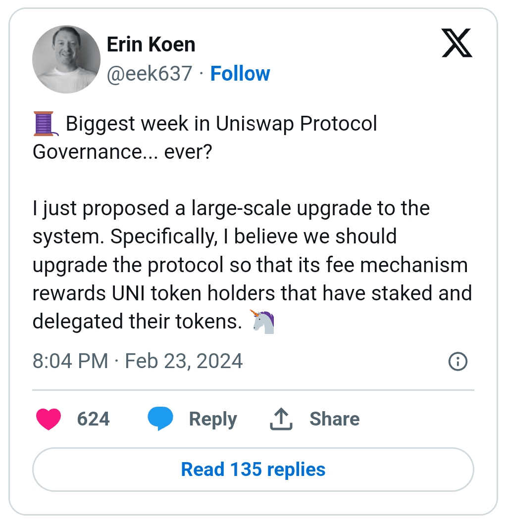La Fondazione Uniswap ha presentato una proposta per utilizzare il meccanismo di commissione del protocollo per premiare i possessori di token UNI che puntano e delegano i loro token. Secondo la proposta, la modifica è progettata per incentivare la "delega attiva, impegnata e ponderata" nel processo di governance di Uniswap.