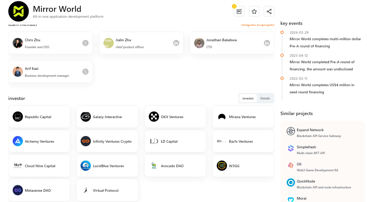 Dietro Sonic, Mirror World è una piattaforma integrata di sviluppo di applicazioni che offre soluzioni per mercati in-app multicatena, servizi di gestione NFT, verifica dell'identità sociale e soluzioni di portafoglio MPC. Mirror World ha ricevuto investimenti da istituzioni come Galaxy Interactive, OKX Ventures, Republic Crypto, Alchemy Ventures e Mirana Ventures.