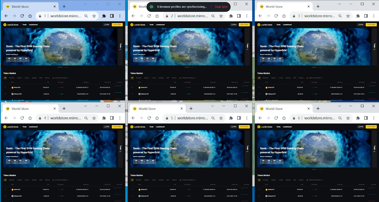 Quando coltivi l'airdrop, ti suggeriamo di utilizzare il browser delle impronte digitali di Morelogin e di utilizzare la funzione di sincronizzazione per aprire più finestre, in modo da poter interagire con più account contemporaneamente, il che fa risparmiare notevolmente tempo e migliora l'efficienza. Inoltre supporta la sincronizzazione ritardata di ciascuna finestra e il supporto per ciascuna finestra per inserire valori diversi, in modo che la tua interazione sia più umanizzata(Registrati ora per una prova gratuita di due settimane con accesso a