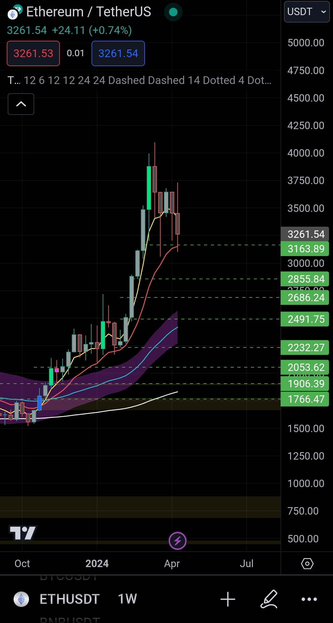Il prossimo è Ethereum e ultimamente ha avuto una bella correzione. Avevo la mia posizione pronta dal 20 marzo quando ho scritto un articolo su ETH. Sì, la posizione era bassa in questo momento e ho rivalutato la situazione e ho messo la mia voce un po' più in alto