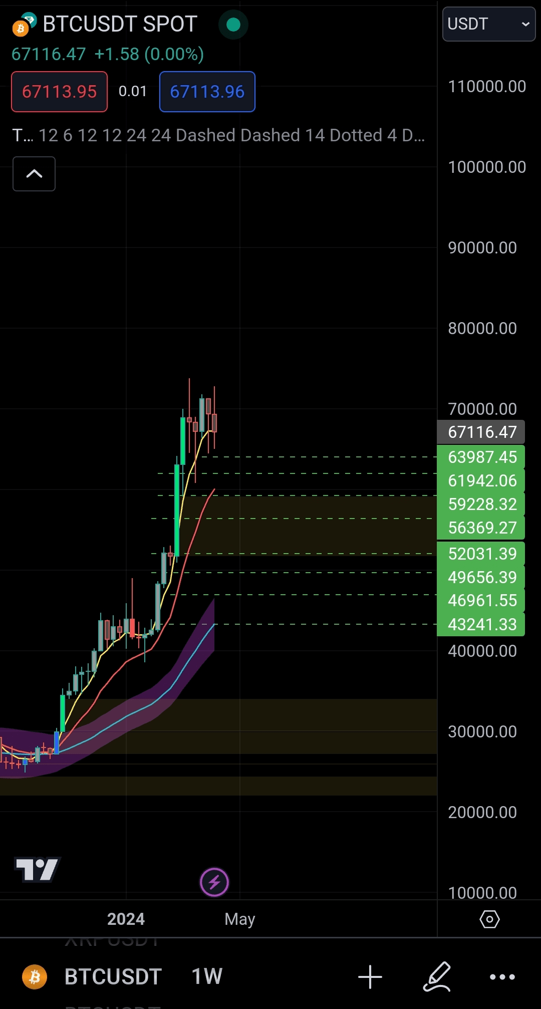 Ci sono i miei livelli di ingresso per Bitcoin e per favore non dirmelo troppo, fratello. Dobbiamo essere preparati al peggio, non al meglio, ogni volta che si tratta di una correzione del 20, 25% in criptovalute: solo un altro giorno in ufficio. Il modo in cui sto giocando a questo gioco è così. Al primo ingresso prendi un piccolo capitale e ad ogni ingresso successivo lo raddoppi. Ad esempio, hai 1500 dollari preparati per BTC al primo ingresso, metti 50 dollari al secondo, 100, al terzo 150, al quarto 200 e così via e così via. Non puntare mai tutto in una volta!!! raddoppiare su ciascuno. E il minimo che hai acquistato mentre stiamo salendo non HODL per molto tempo, prenota i tuoi grandi profitti togli liquidità dal mercato, quindi hai capitale per la prossima correzione che arriverà, fidati di me e inoltre hai ancora un po' di BTC quindi tu non ci stiamo perdendo nulla. Forse non scenderà così in basso e se presti attenzione al movimento non appena vedi la formazione a W, usa il tuo capitale residuo e immettilo nel mercato. Prendi in considerazione questo concetto