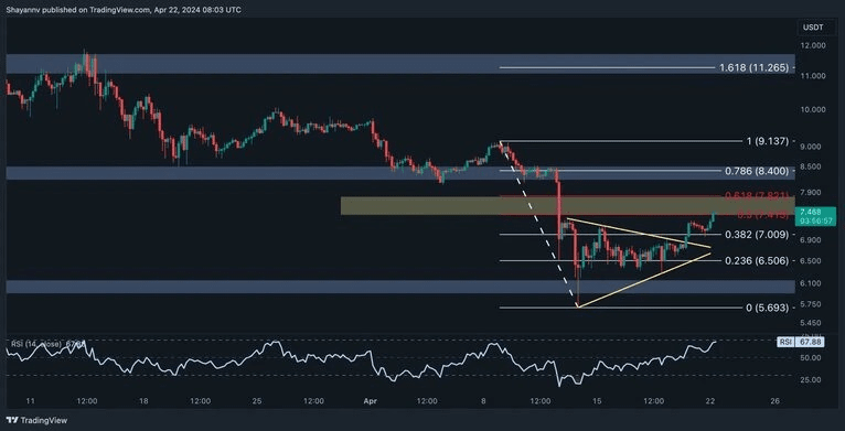 Attualmente, il prezzo di Polkadot è entrato in un intervallo cruciale e decisivo definito dai livelli di Fibonacci 0,5 (7,4 $) e 0,618 (7,8 $), dove potrebbe essere presente una quantità significativa di offerta.