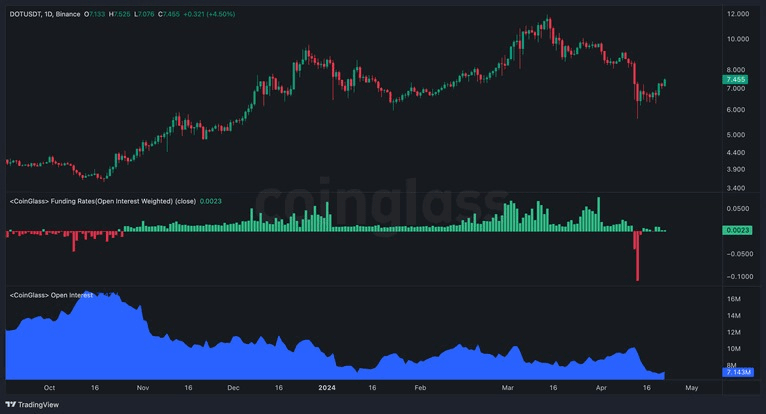 Il grafico allegato rappresenta visivamente le metriche Funding Rates e Open Interest insieme ai movimenti di prezzo di Polkadot. È evidente dal grafico che, a seguito di un calo significativo del valore di DOT, si è verificato un calo corrispondente in entrambe le metriche.