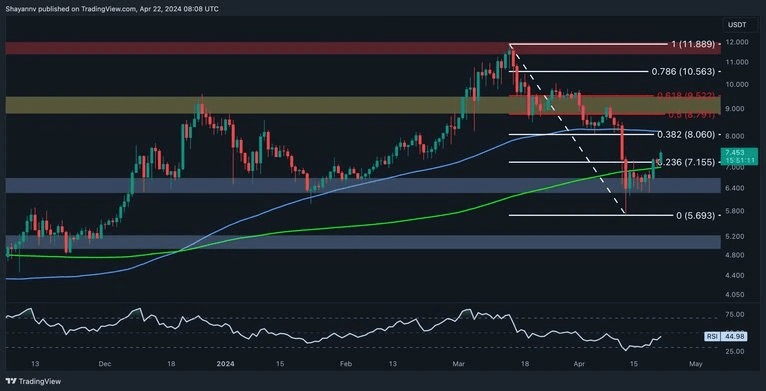 Come parte della nostra analisi completa dei prezzi di Polkadot, abbiamo esaminato i notevoli cambiamenti recenti nel comportamento del mercato. Uno sguardo più attento al grafico giornaliero rivela che dopo il consolidamento attorno al significativo livello di supporto di $ 6, gli acquirenti hanno preso il controllo, innescando un notevole rimbalzo rialzista. Questa ripresa ha spinto il prezzo DOT a reclamare la media mobile a 200 giorni precedentemente violata a $ 7, segnalando una prospettiva rialzista per la sua traiettoria a lungo termine.