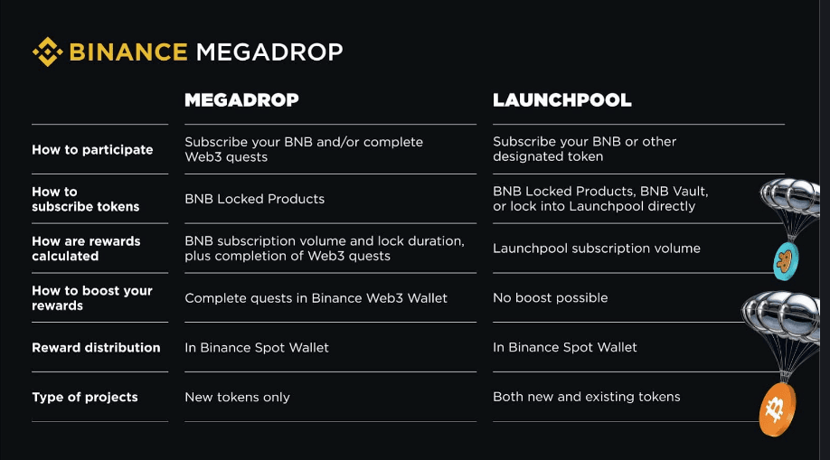 Binance Megadrop rappresenta un'espansione strategica delle operazioni di Binance nell'attuale mercato rialzista, a differenza di alcuni dei suoi concorrenti che si concentrano esclusivamente sui servizi di scambio. Funge da piattaforma di lancio strategica per progetti Web3, aiutandoli a crescere e ad aumentare la visibilità collegandoli direttamente alla comunità globale di utenti verificati di Binance.