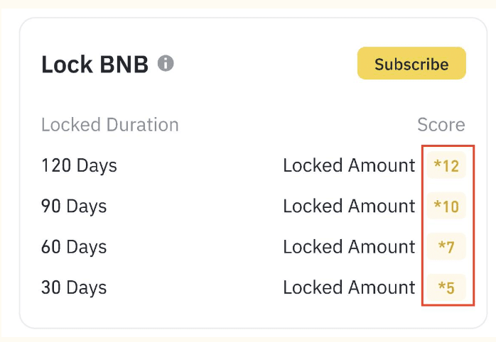 A seconda del periodo di blocco scelto nel prodotto BNB Simple Monetization Lockup, i tuoi punti verranno calcolati come 30, 60, 90 o 120 giorni. Notare che: