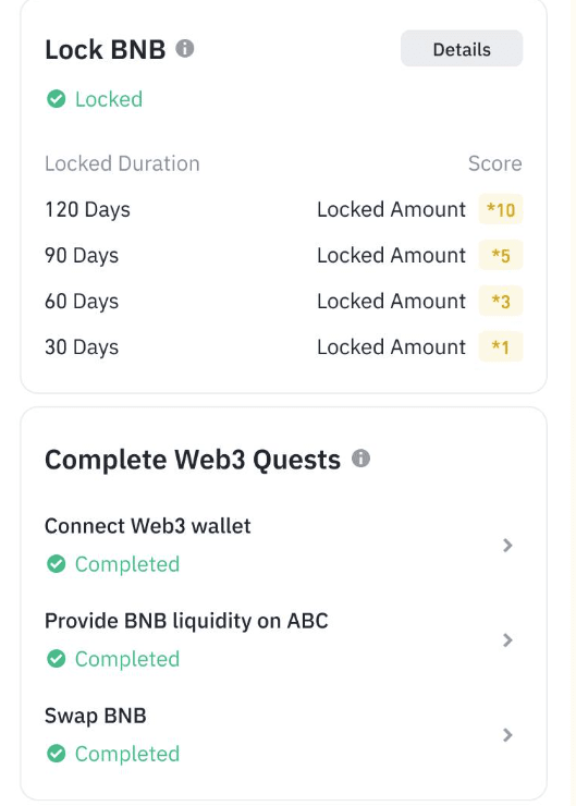 - Passaggio 3: Registrati per i prodotti bloccati BNB e/o completa le attività Web3 per accumulare punti. Più alto è il punteggio, maggiore è la ricompensa.