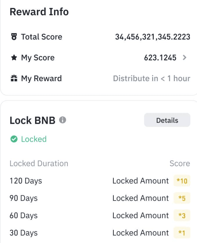 Punti BNB bloccati: gli utenti riceveranno punti in base alla quantità di BNB registrati e al momento della registrazione. Registrazioni più lunghe producono punteggi più alti. Questo punteggio può variare perché si basa sulle medie delle istantanee giornaliere.