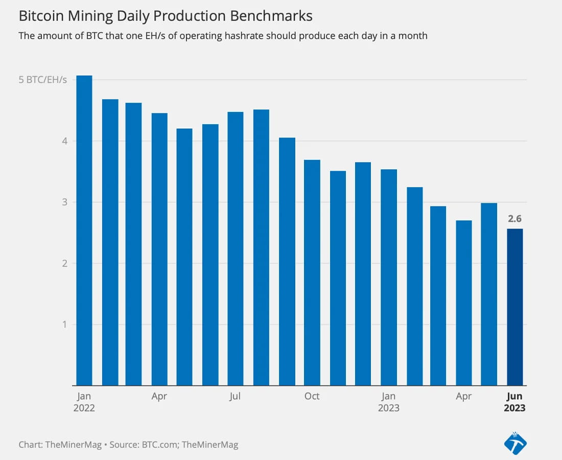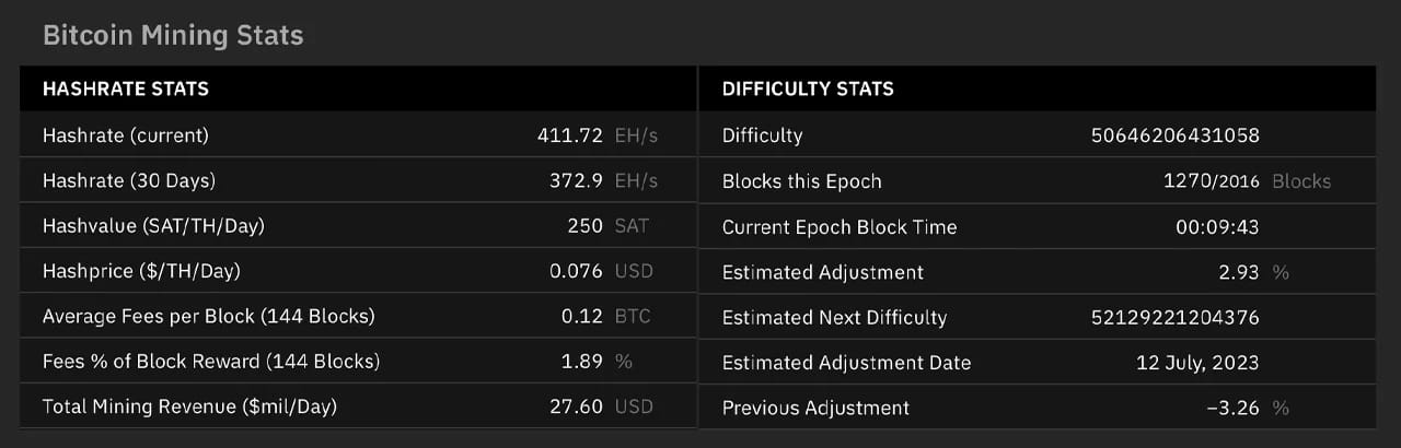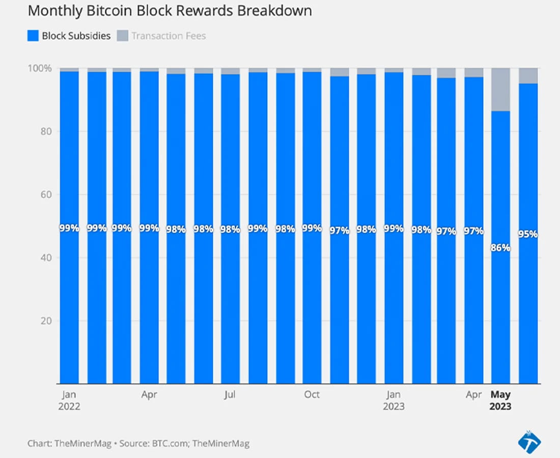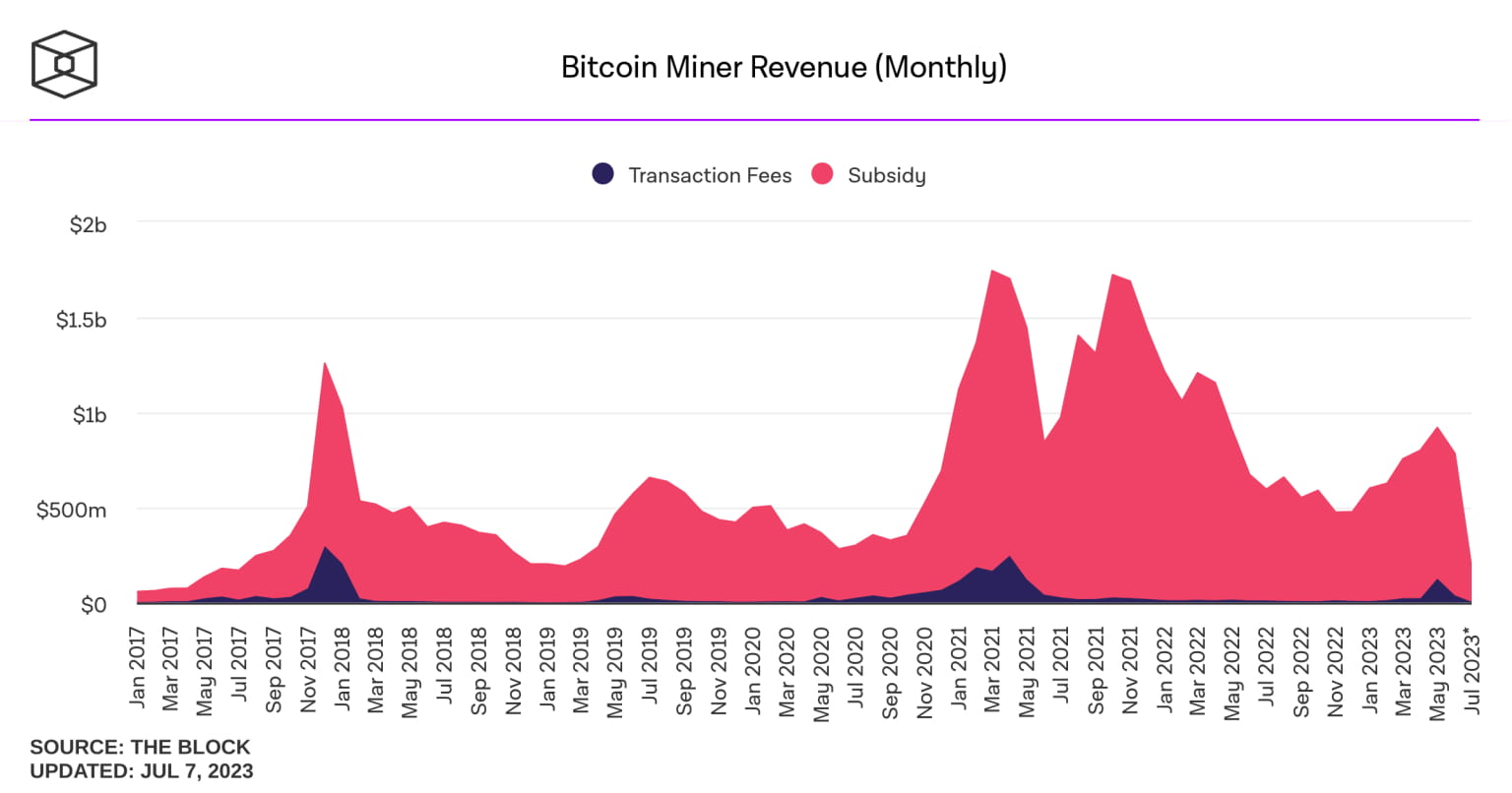 Secondo i dati del 7 luglio 2023, le commissioni rappresentavano l'1,89% dei guadagni generati da 144 blocchi. A giugno, i minatori di bitcoin hanno guadagnato collettivamente 783,76 milioni di dollari di entrate, con le sole ricompense per blocco (escluse le commissioni) pari a 745,45 milioni di dollari. A maggio, i minatori hanno acquisito un totale di 919,22 milioni di dollari di entrate, con 793,3 milioni di dollari provenienti dal sussidio per blocco, secondo i dati.