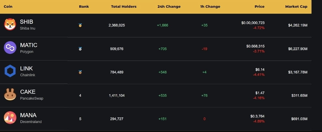 Secondo i dati di CryptEye, il numero di wallet che detengono SHIB è aumentato di 1.679 da ieri mattina. Allo stesso tempo, LINK ne ha aggiunti 548, il numero di holder di MATIC è aumentato di 707 e quello di MANA è aumentato di 151.