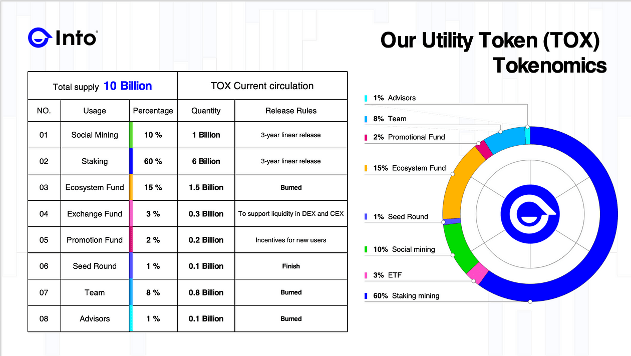 Il processo di combustione completo di TOX è gestito dal team INTO e dalle istituzioni affiliate. In combinazione con la riduzione della fornitura totale a 21 milioni di TOX, ciò dimostra il forte impegno del team INTO verso un meccanismo deflazionistico e la loro fiducia nello sviluppo a lungo termine del progetto. Questa misura renderà TOX un asset ancora più raro, aumentandone ulteriormente il valore. Entro il 2024, TOX sarà quotato sulle principali piattaforme CEX come Binance e OKX e sarà integrato in centinaia di progetti di ecosistema, il che aumenterà ulteriormente la domanda di TOX, spingendone ulteriormente il valore.