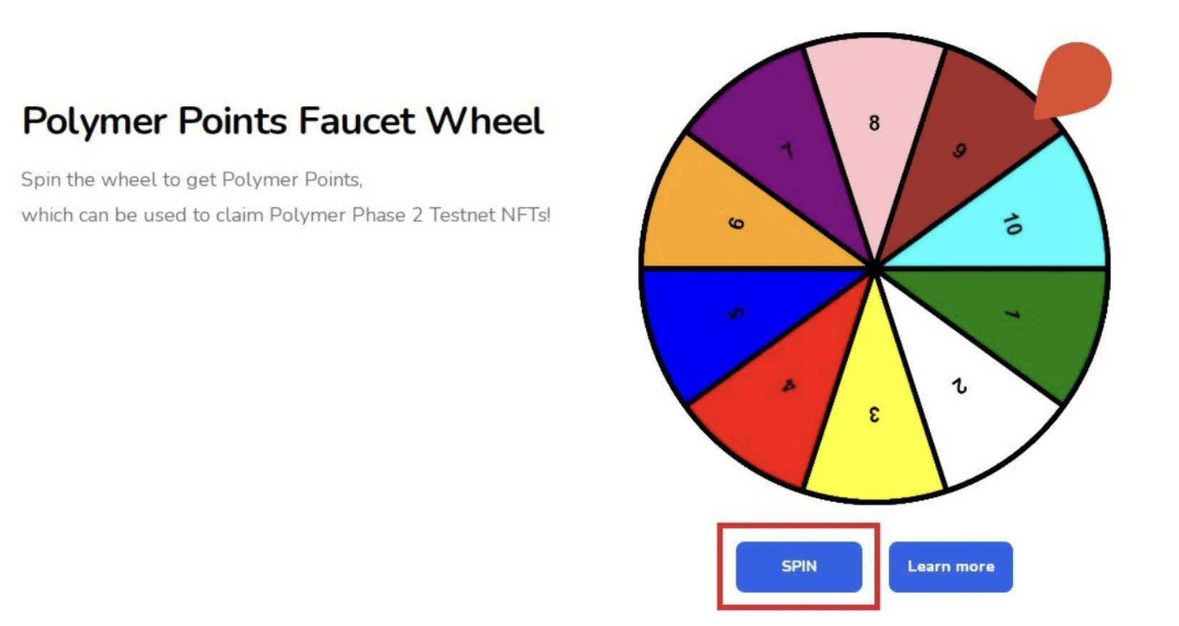 1. Dopo aver cliccato su "Faucet Points by gaming" per accedere, ci sarà una piattaforma girevole. Fai clic su "SPIN" per ottenere punti Polymer. La piattaforma girevole può ruotare una volta ogni 5 minuti. Ripeti questa operazione per ottenere più punti Polymer.
