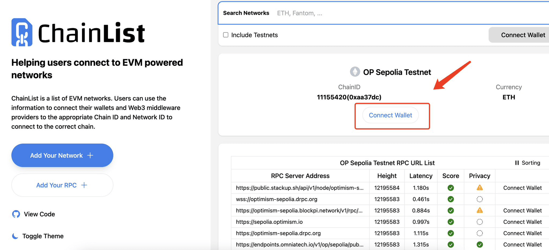 Collega il portafoglio e seleziona Ottimismo Sepolia