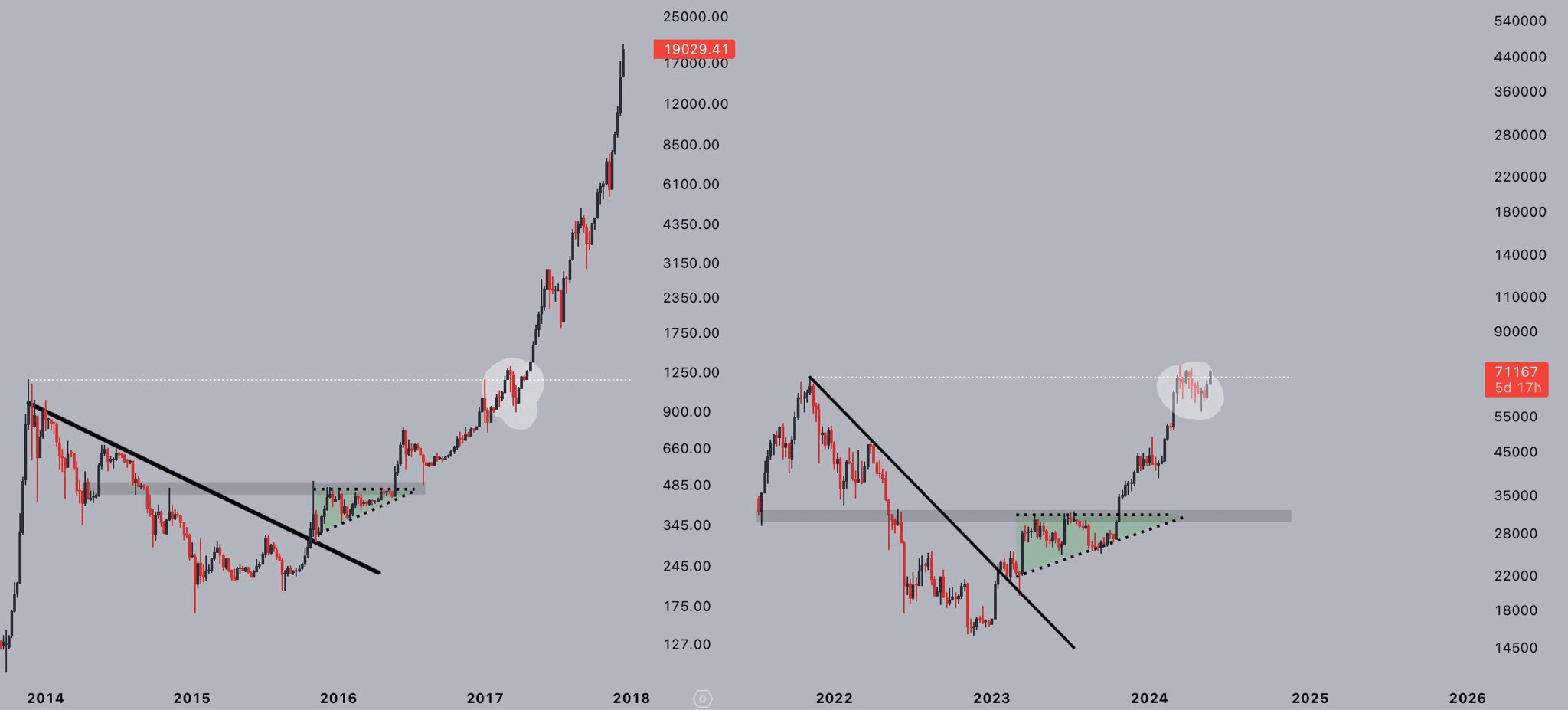 Questa tendenza dei prezzi ricorda molto la corsa al rialzo del 2017, che ha visto il prezzo del BTC aumentare di oltre l'800%, da $ 2.100 a quasi $ 20.000 in sei mesi, un aumento che si è verificato da maggio a dicembre. Oggi, l'analista del trading di criptovalute ritiene che la storia si stia ripetendo, poiché gli schemi appaiono sorprendentemente simili, secondo il suo post del 21 maggio.