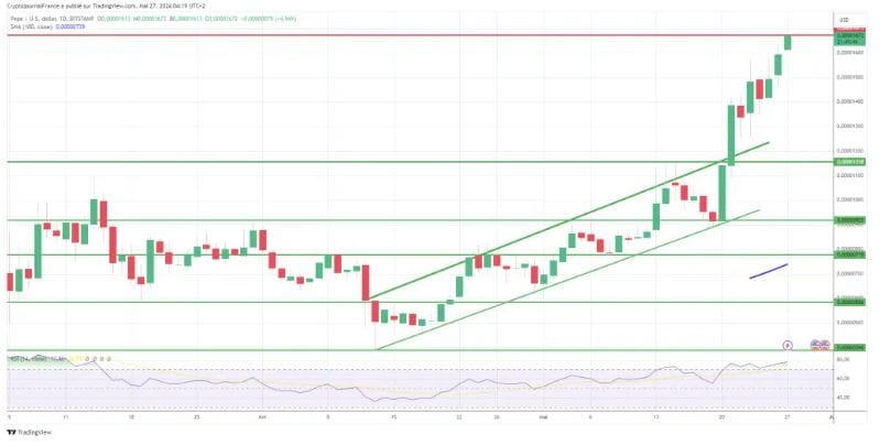 Dal punto di vista dell'analisi tecnica, il trend di PEPE rimane fortemente rialzista, ma l'entità dei recenti guadagni richiede cautela a causa del rischio di prese di profitto, soprattutto perché negli ultimi giorni la tendenza è stata piuttosto neutrale per la maggior parte delle altre criptovalute.