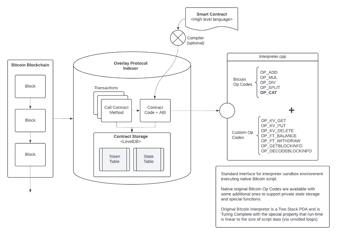 Proponiamo un metodo per creare ed eseguire contratti intelligenti per varie risorse digitali sovrapposte simulando la macchina virtuale Bitcoin e il suo interprete di script. In questo approccio, la blockchain di Bitcoin non solo fornisce timestamp e dati per i programmi di contratto intelligente archiviati sulla catena, ma allo stesso tempo l’esecuzione di questi programmi viene eseguita anche in un ambiente sandbox attraverso vari indicizzatori di protocolli sovrapposti. I nodi dell'indicizzatore del protocollo overlay sono gestiti congiuntamente da sviluppatori di applicazioni, fornitori di servizi e utenti, formando un consenso spontaneo. Questo concetto e la sua tecnologia sono ampiamente applicabili a tutti i protocolli overlay, con gli opportuni adattamenti al rispettivo indicizzatore del protocollo overlay.