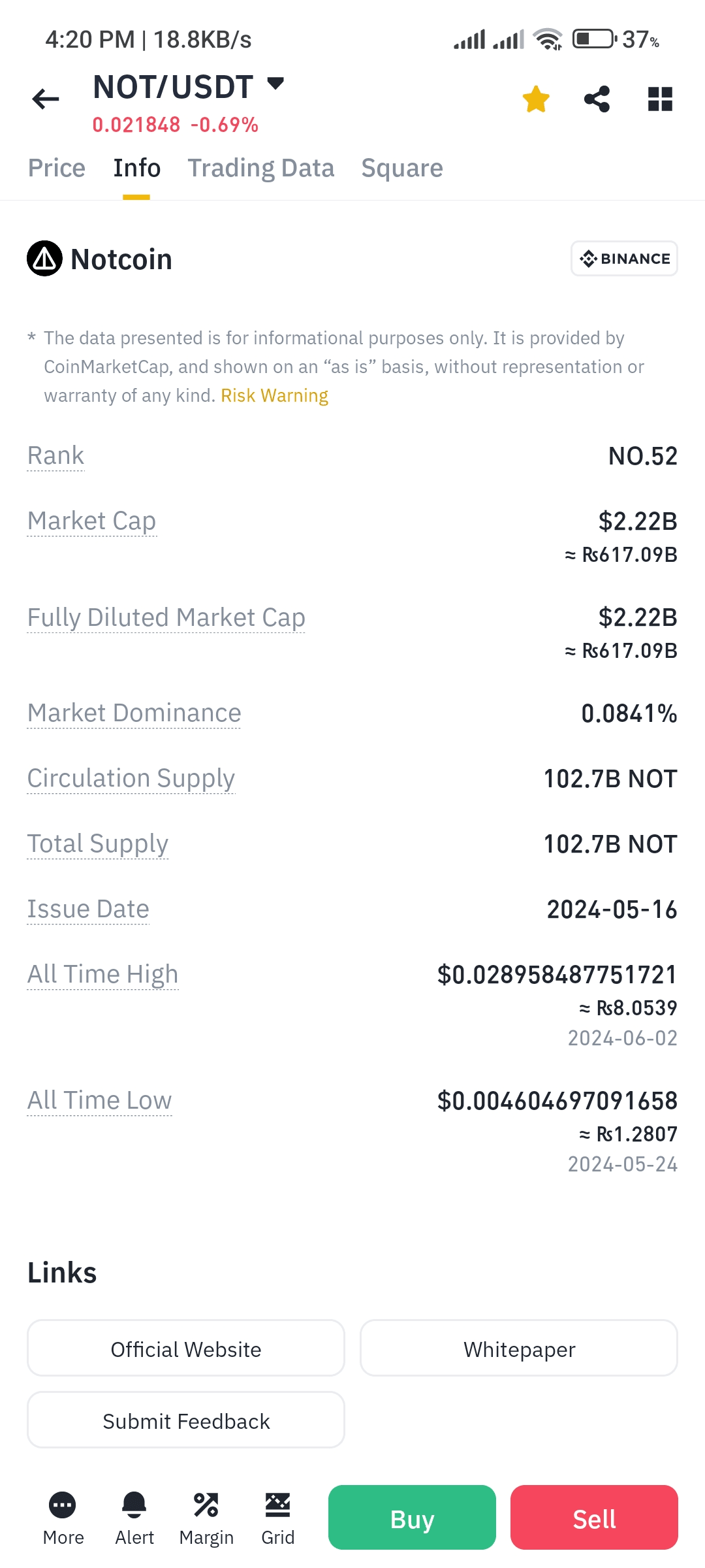 Le informazioni aggiuntive fornite nel secondo screenshot forniscono un contesto più chiaro per analizzare il valore futuro di NOT/USDT. Ecco un riepilogo dei dati principali: