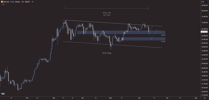 Il prezzo è attualmente nell'area principale di 65-67k, che potrebbe offrire supporto. Se dovesse rompersi, 61-63k sarà il prossimo potenziale supporto